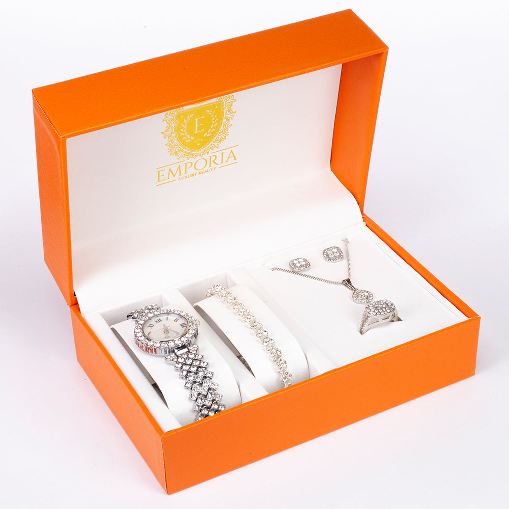 Pozlacený Slitinový Hodinky s Bílým Emporia® Křišťálem (Náhrdelník+Náušnice+Náramek+Přívěsek) KÓD: EFXSET01