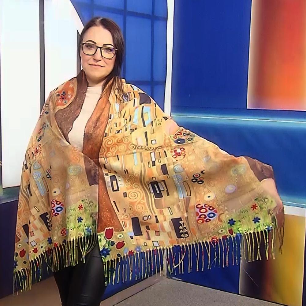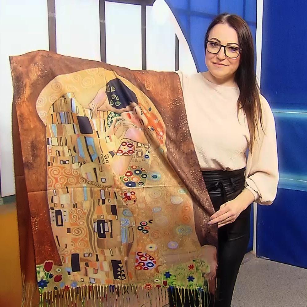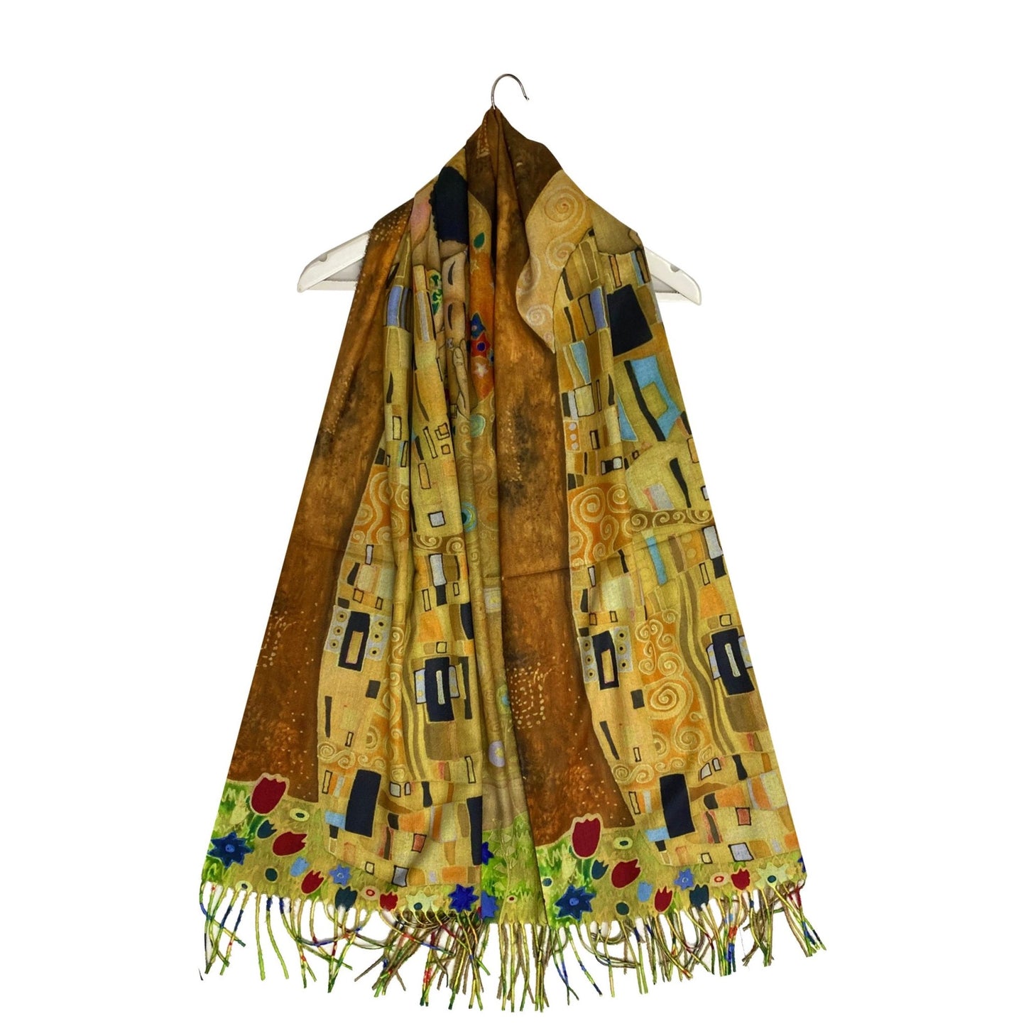 Rozměry: 70 cm x 180 cmMateriál: 60% vlna, 40% akrylBarva/vzor: Světoznámá malba: Klimt - The Kiss