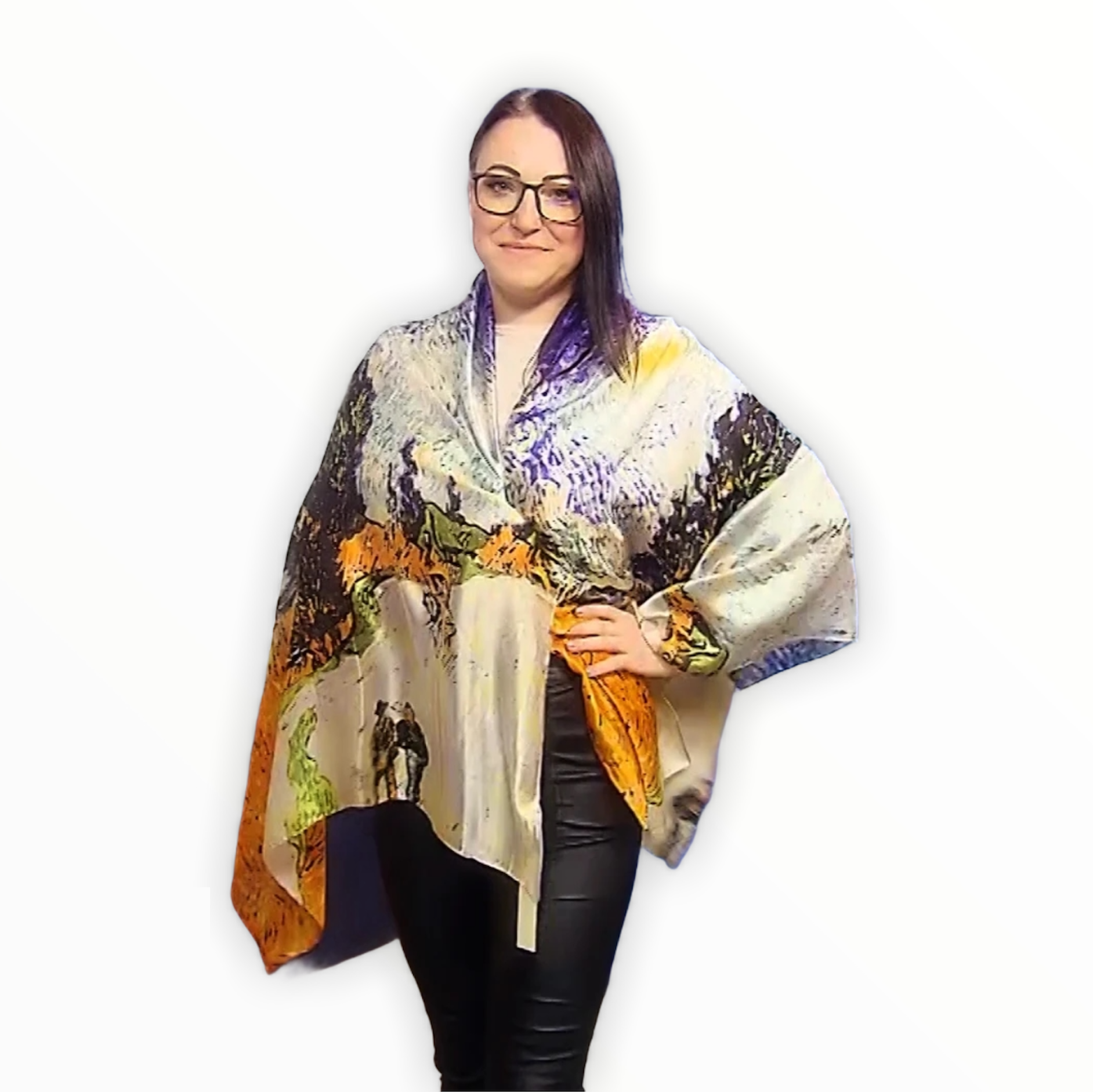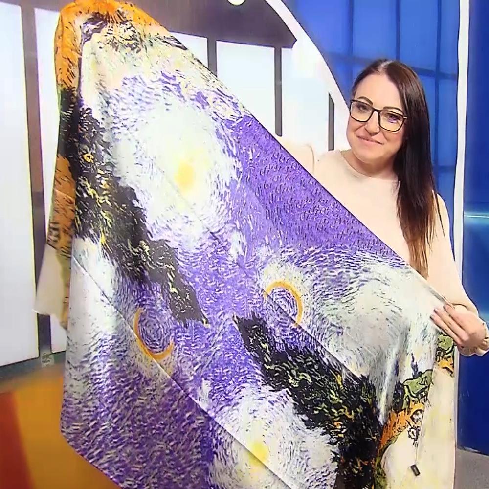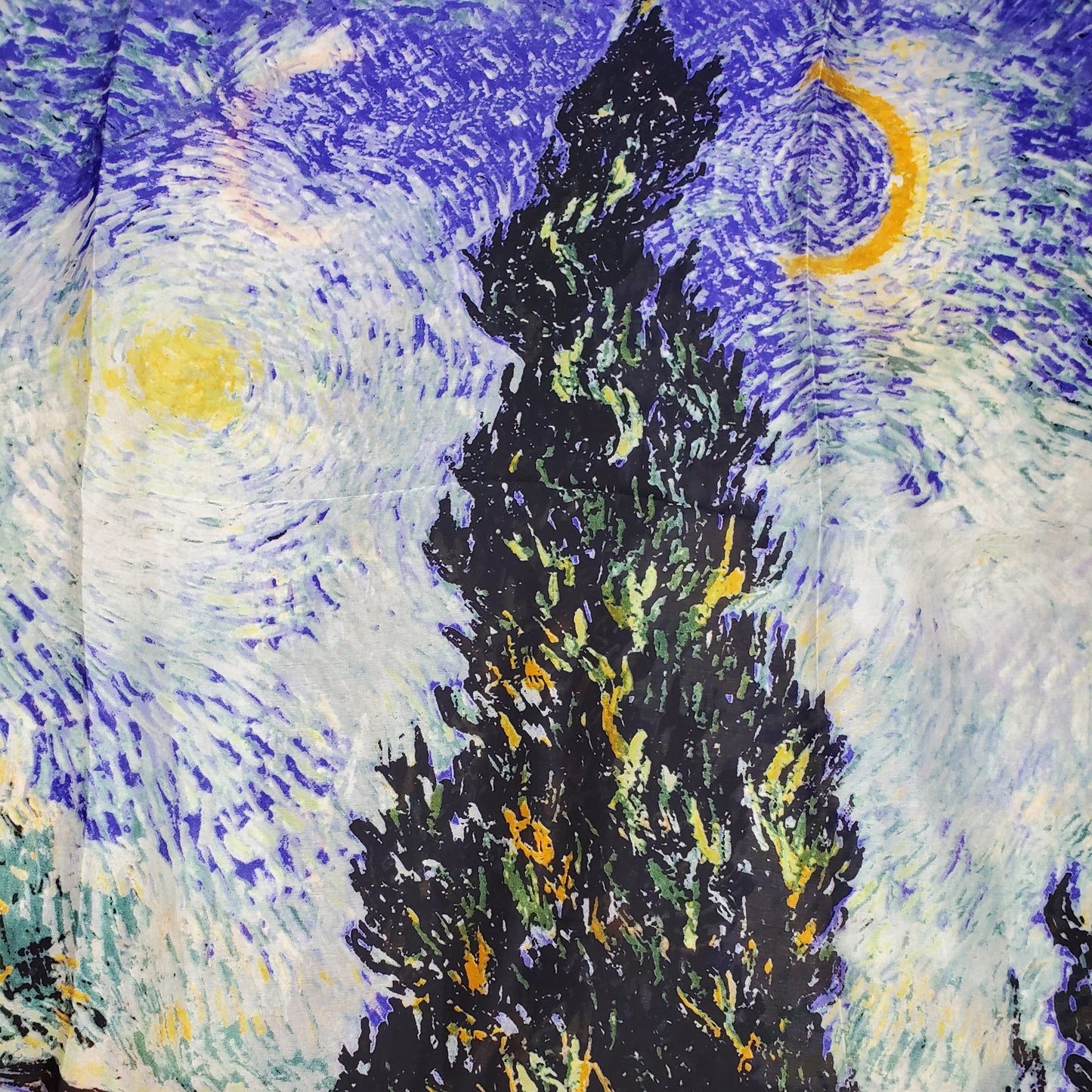Rozměry: 90 cm x 180 cmMateriál: 100% hedvábíBarva/vzor: Světoznámá malba: Van Gogh Cypřiš a Hvězda