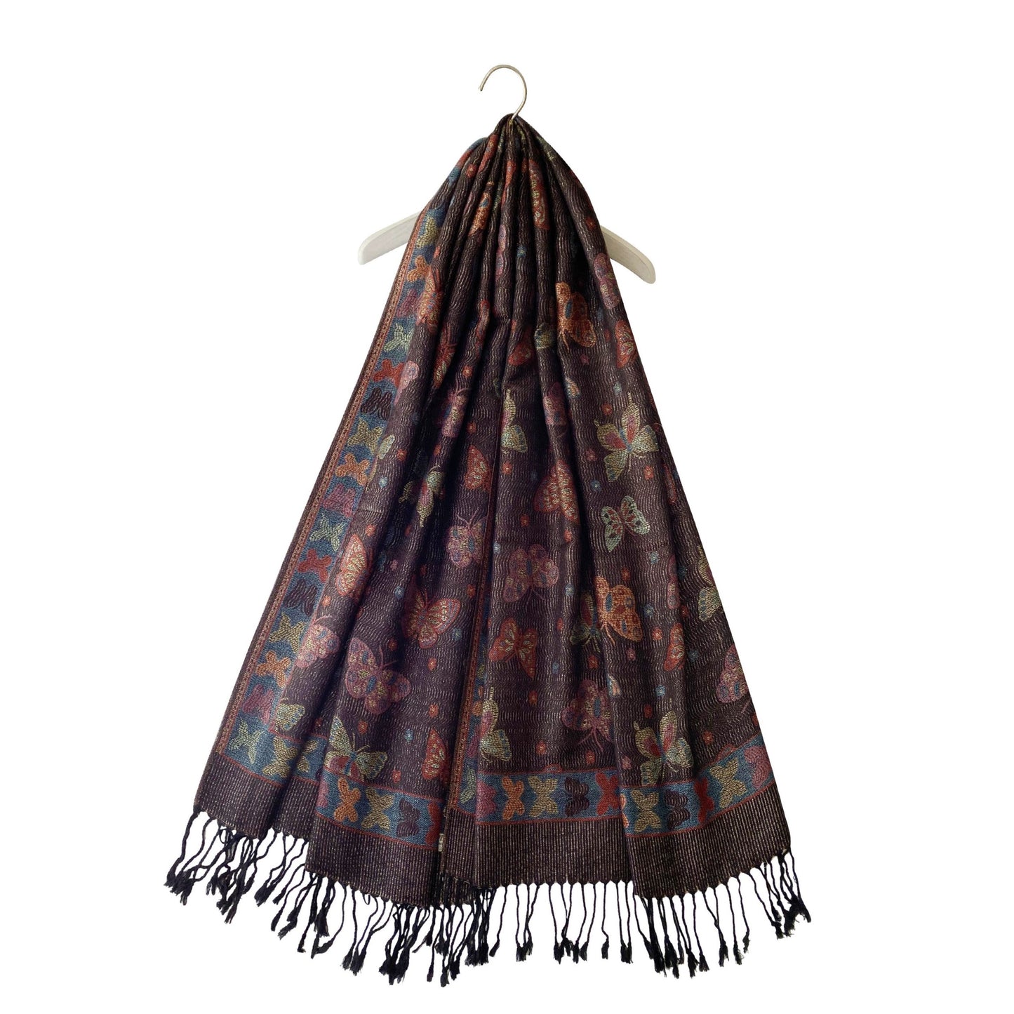 Šála-šátek ze 100% Pravého Pashmina Kašmíru, 70 cm x 170 cm, Lesklá černá s motýlím vzorem