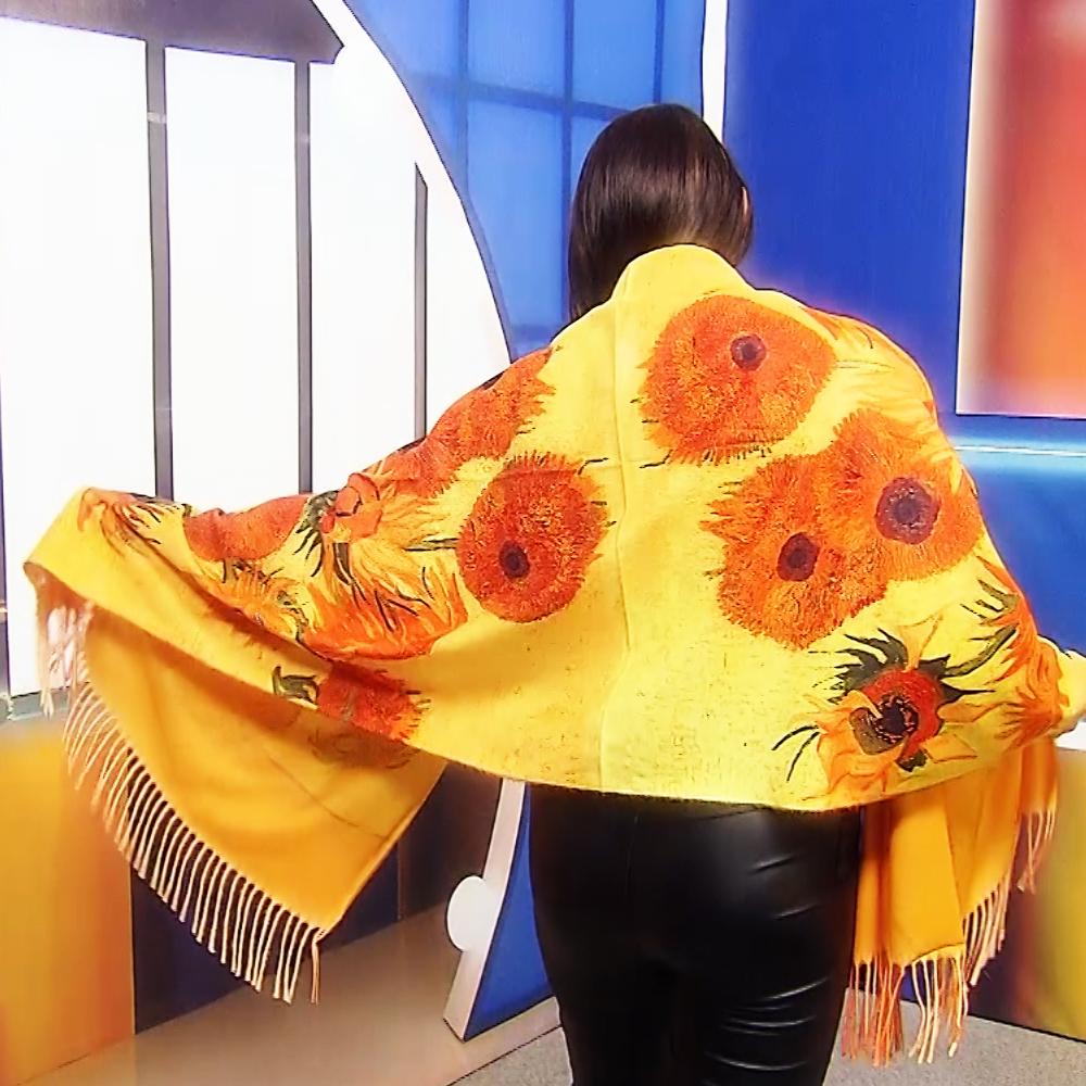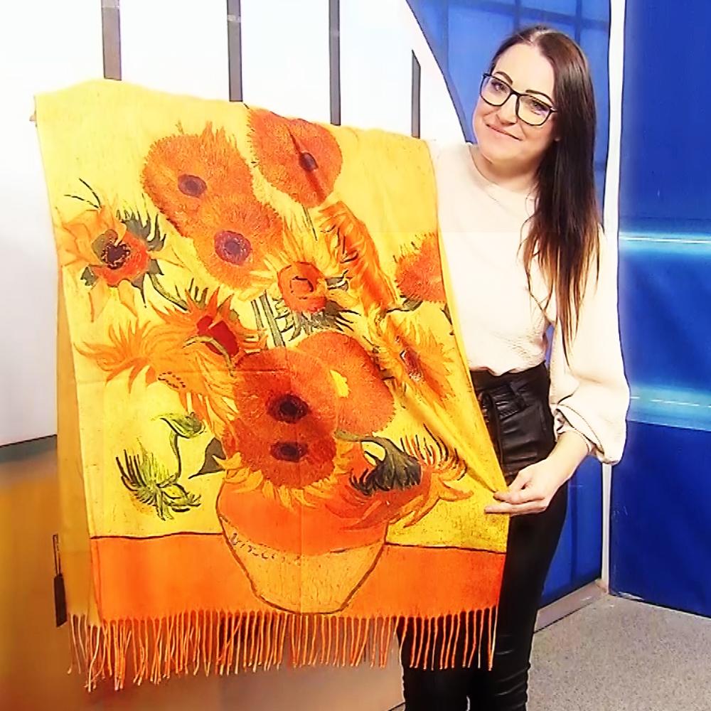 Rozměry: 70 cm x 180 cmMateriál: 60% vlna, 40% akrylBarva/vzor: Světoznámá malba: Van Gogh - Sunflowers